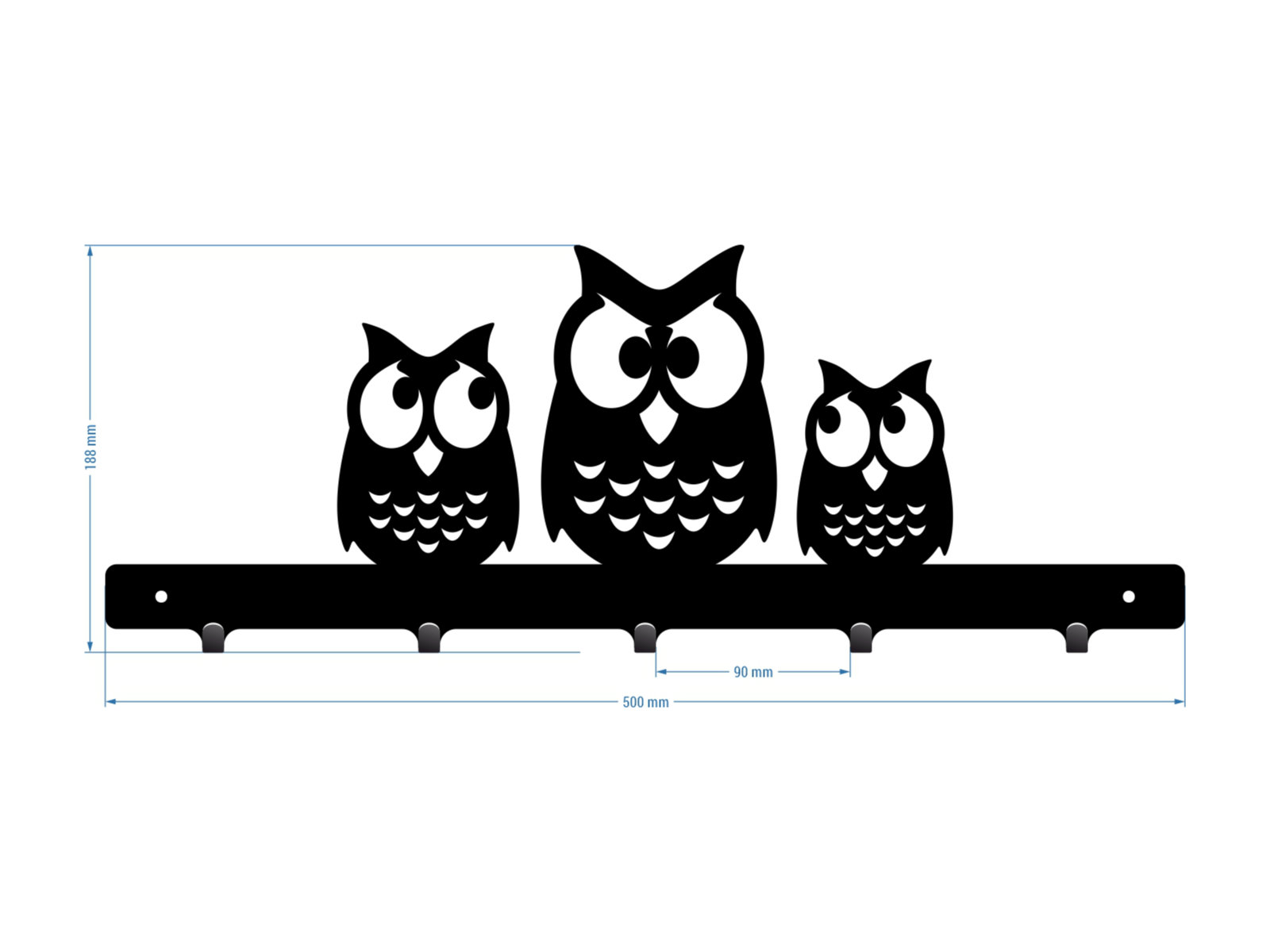 Ozdobny wieszak do przedpokoju z postaciami trzech uroczych sówek. Model ten posiada 5 haczyków na ubrania. Jego całkowita szerokość wynosi 50 centymetrów. Ciekawe wzornictwo z pewnością przyciągnie wzrok każdego!