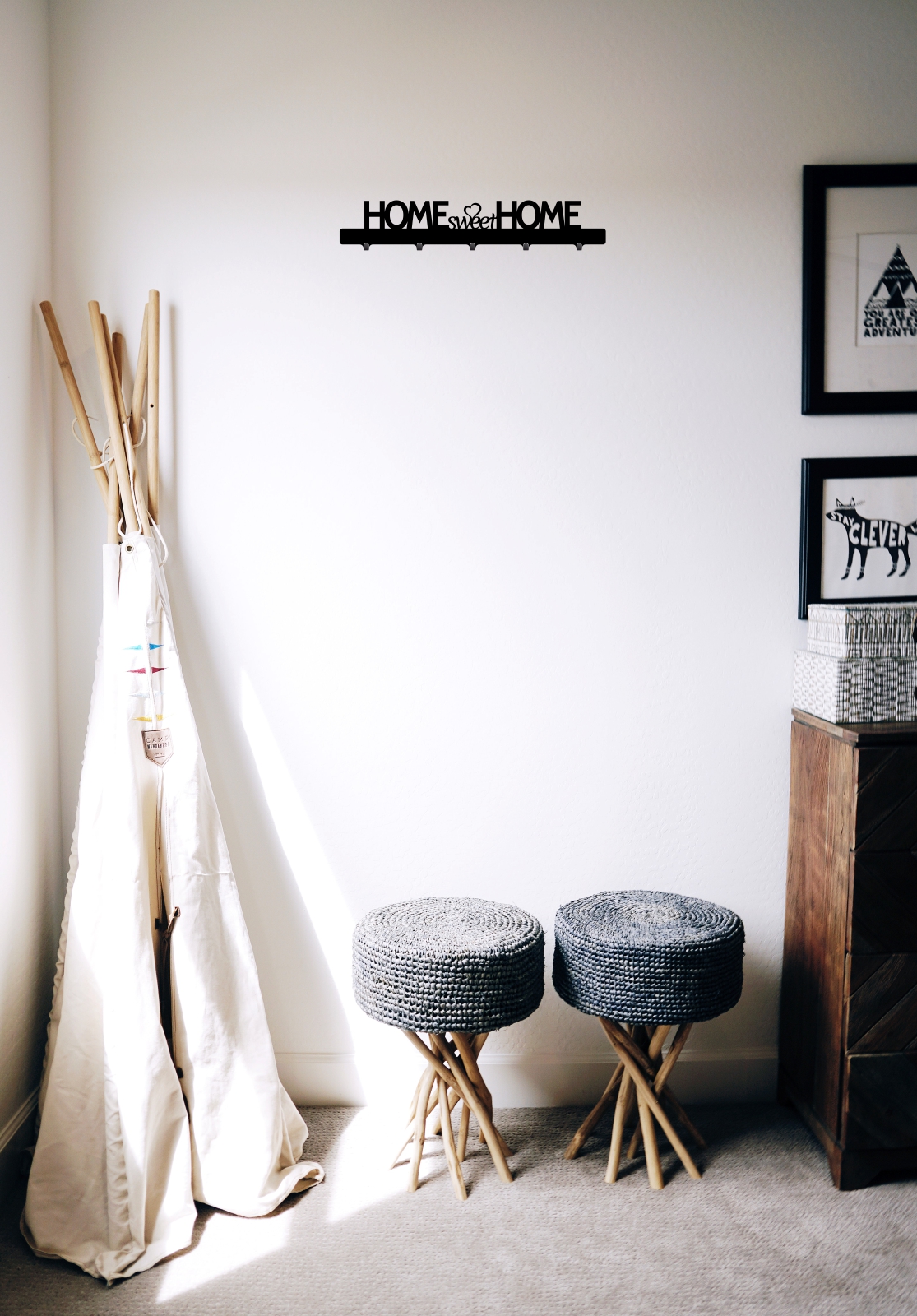 Dekoracyjny ścienny wieszak na kurtki z 5 haczykami na ubrania. Jego całkowita szerokość wynosi 50 centymetrów. Ten model, ozdobiony pięknym napisem ‘Home sweet home” jest idealny nie tylko do przedpokoju!