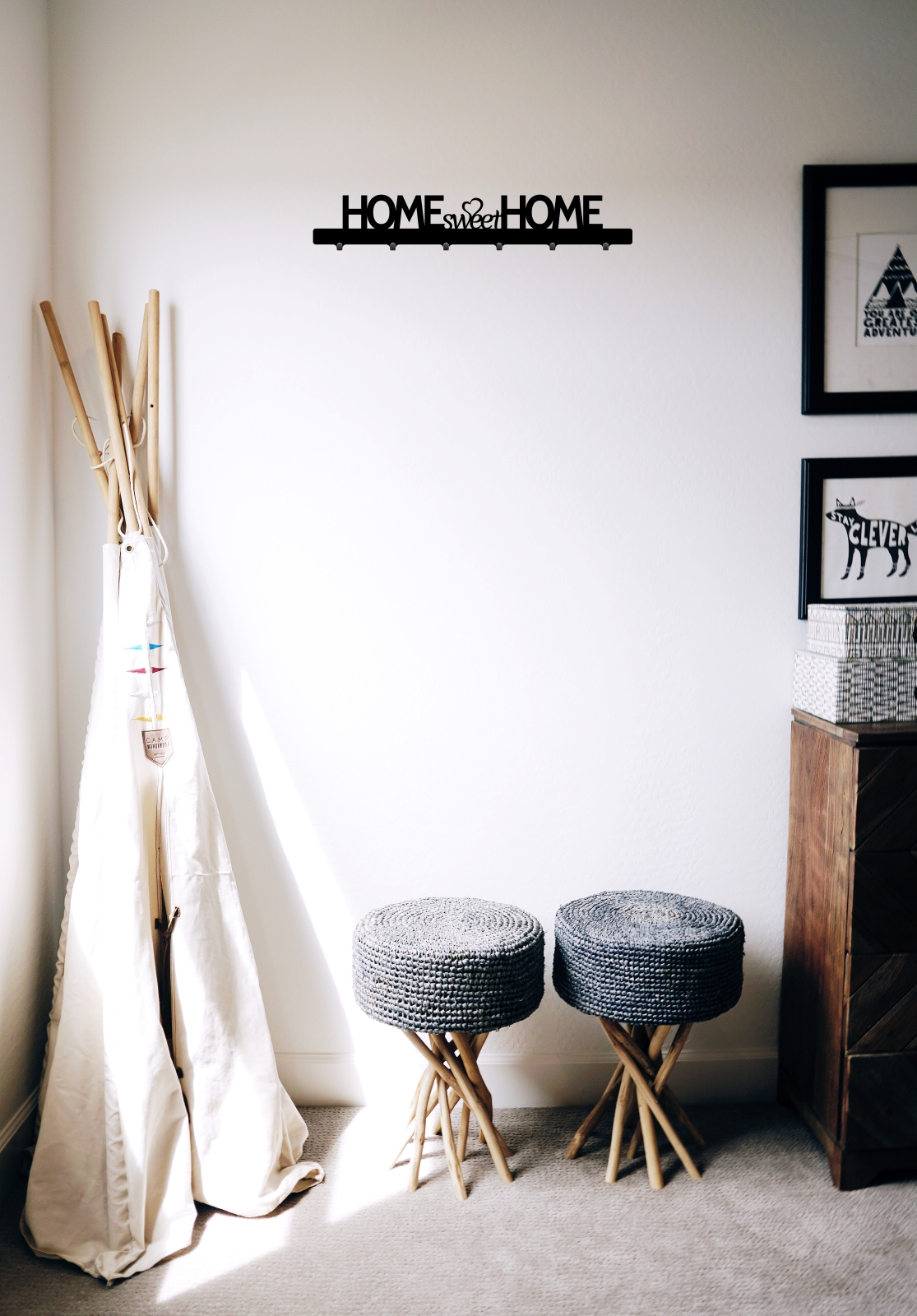 Dekoracyjny ścienny wieszak na kurtki z 6 haczykami na ubrania. Jego całkowita szerokość wynosi 60 centymetrów. Ten model, ozdobiony pięknym napisem ‘Home sweet home” jest idealny nie tylko do przedpokoju!