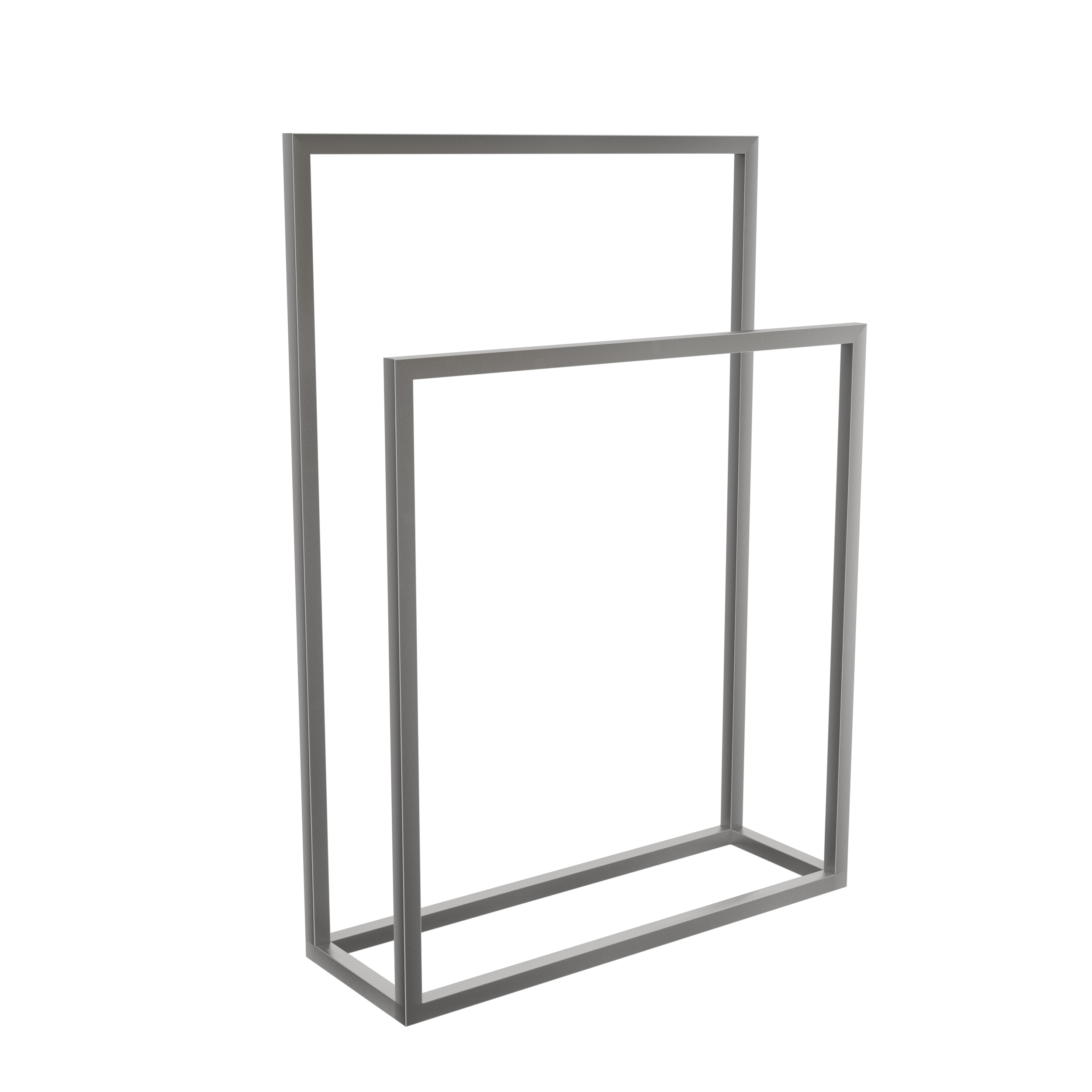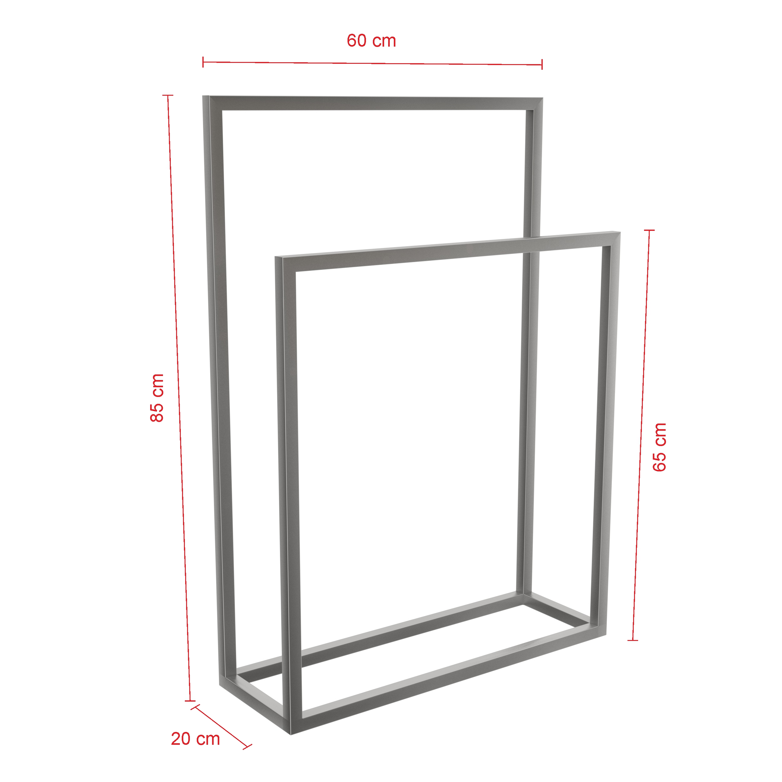 Luksusowy wieszak na ręczniki stojący podwójny, ze szlifowanej stali nierdzewnej. Mierzy 85 cm wysokości, 60 cm szerokości i 20 cm głębokości.