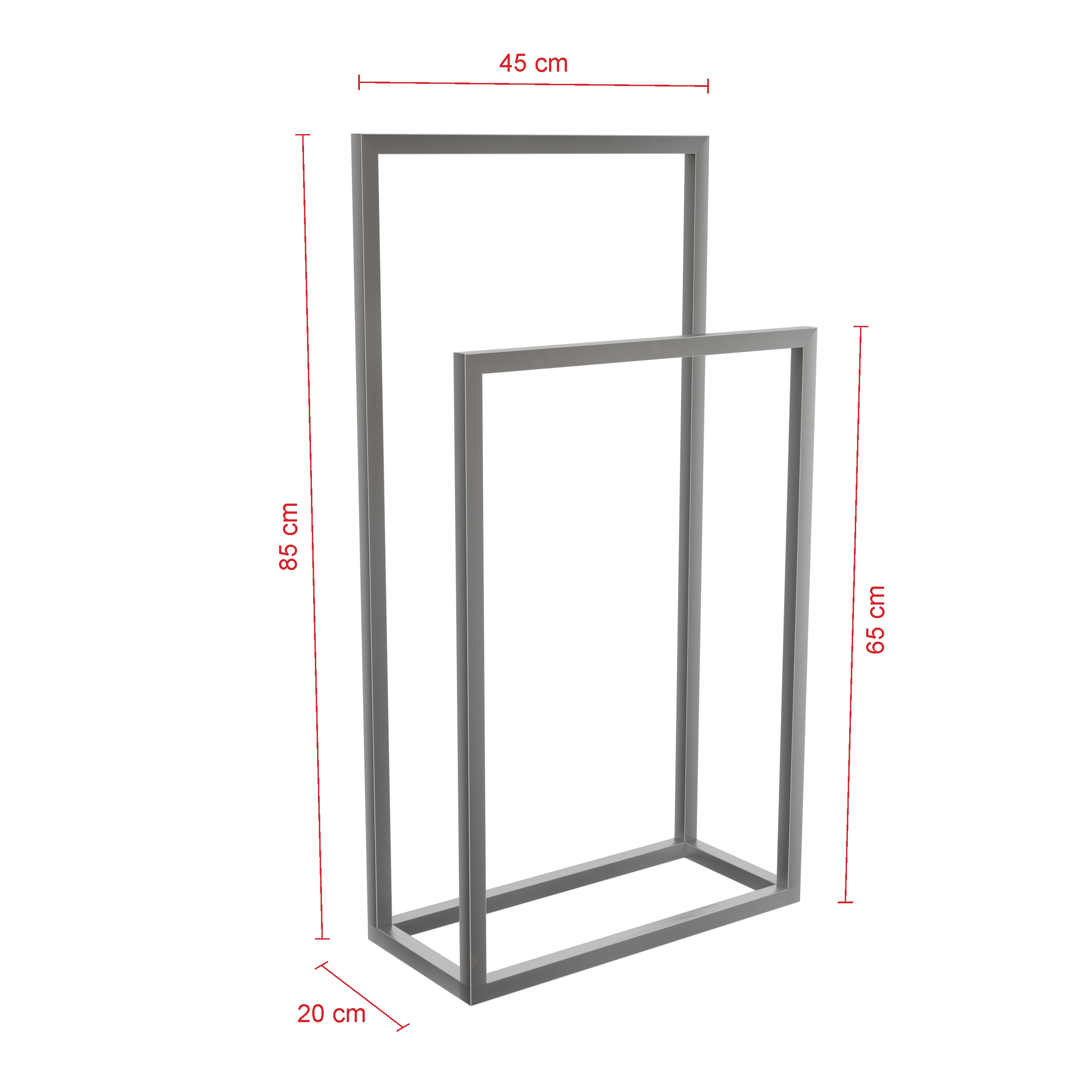 Luksusowy wieszak na ręczniki stojący podwójny, ze szlifowanej stali nierdzewnej. Mierzy 85 cm wysokości, 45 cm szerokości i 20 cm głębokości.